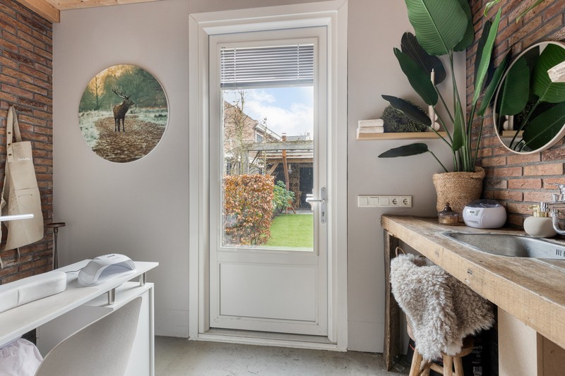 De garage is omgebouwd tot berging en praktijkruimte en is vanuit de woonkamer te bereiken.
