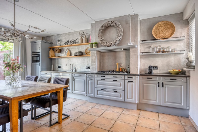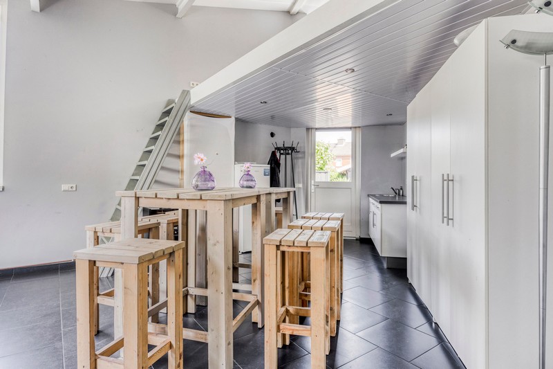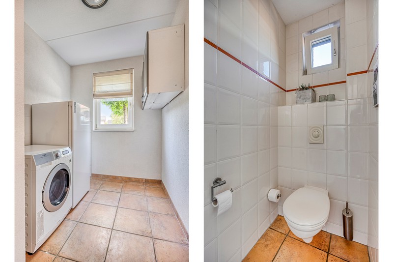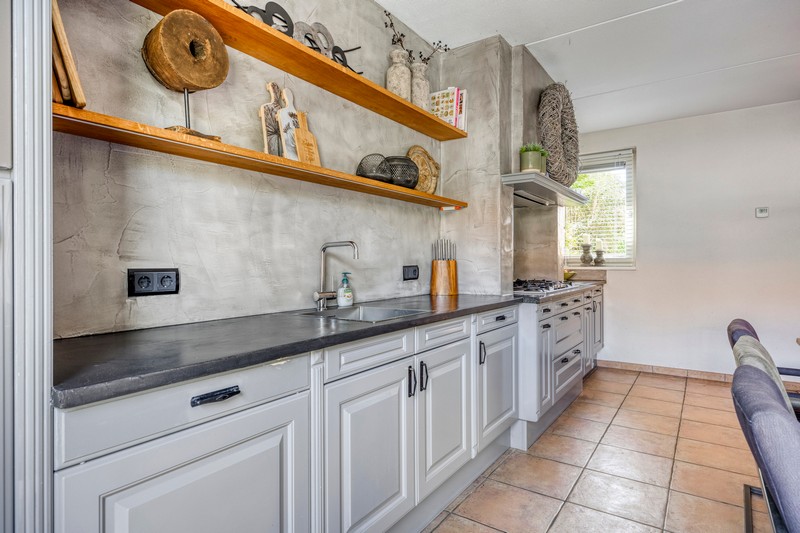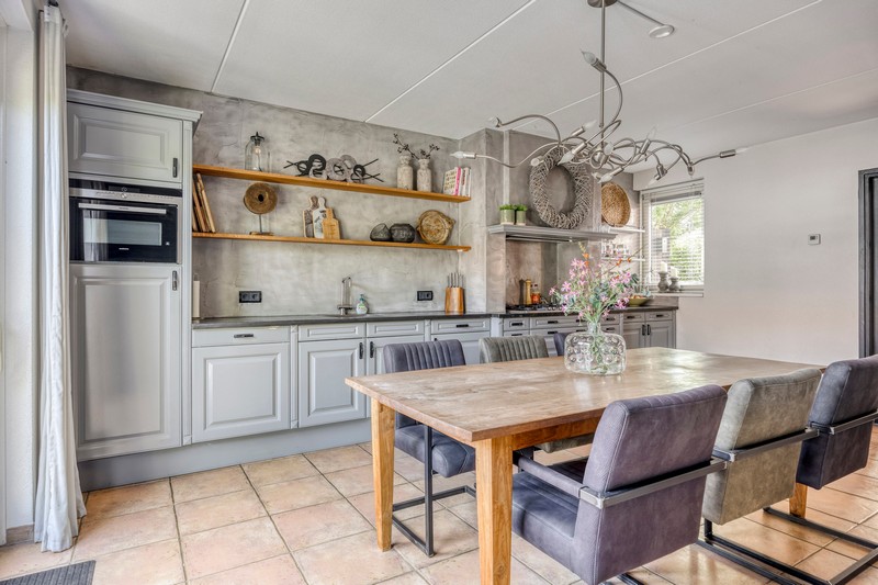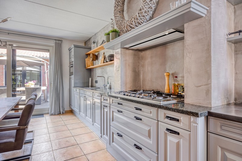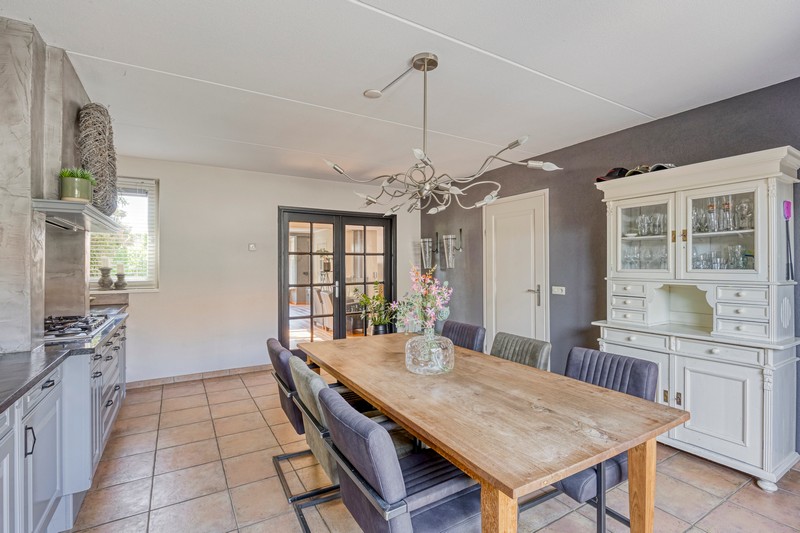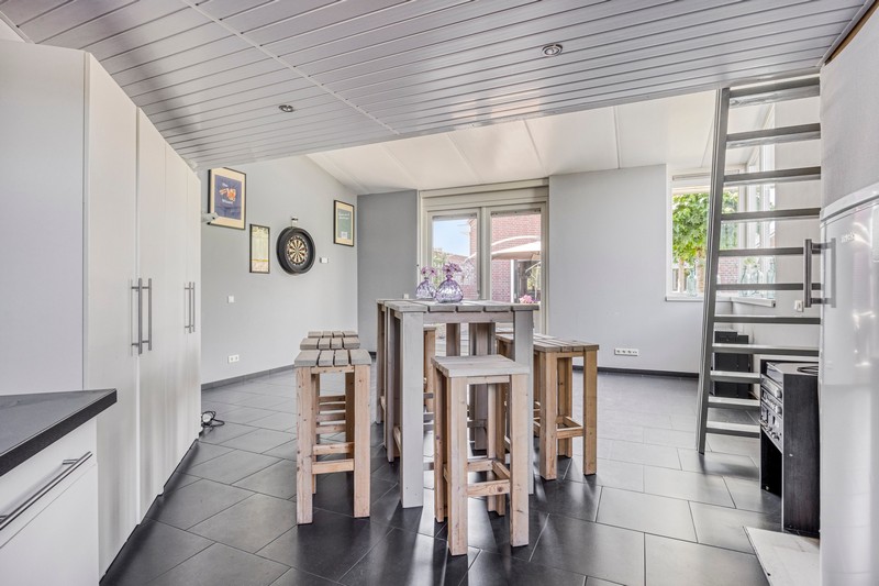De woonkeuken met een landelijke uitstraling, is een heerlijke ruimte waar je kunt koken en kunt zitten. Er is meer dan genoeg ruimte voor het plaatsen van een XXL eettafel. De ruime en nette keuken is voorzien van allerlei inbouwapparatuur. Aan de achterzijde bevinden zich openslaande deuren naar een gezellig terras tussen woonhuis en de daarachter gelegen multifunctionele ruimte maar daarover straks meer. Vanuit de keuken kunnen we via de achteringang naar buiten. Aan weerszijden vinden we de toilet aan de linkerzijde en de bijkeuken aan de rechterzijde. Wat wilt u nog meer?