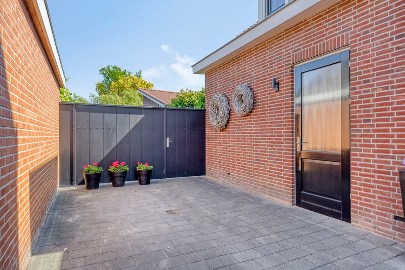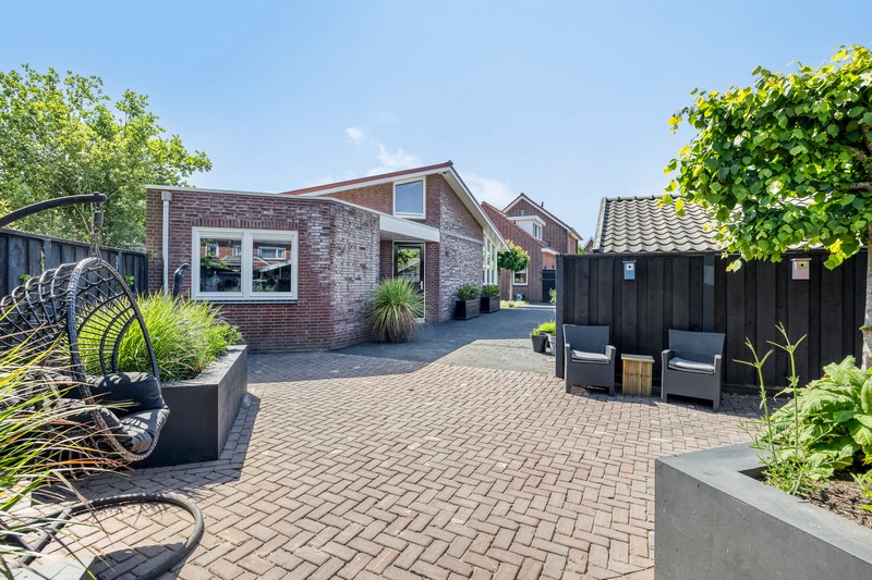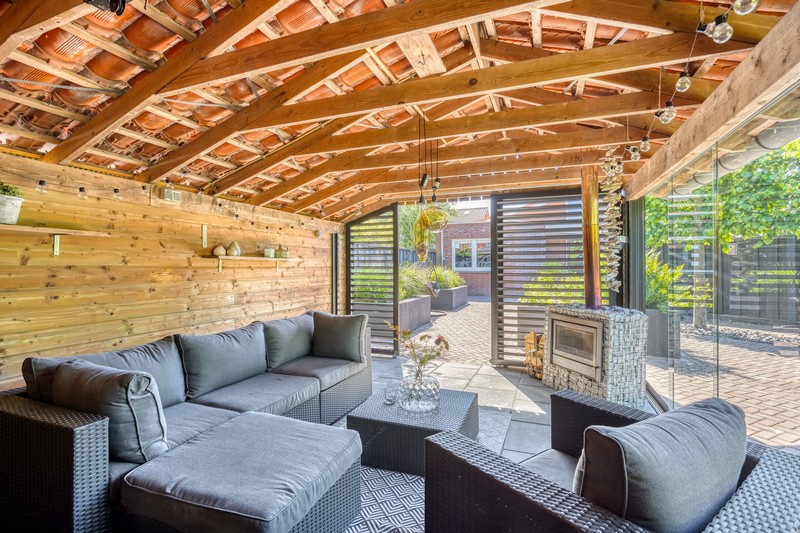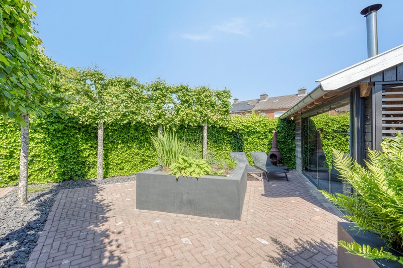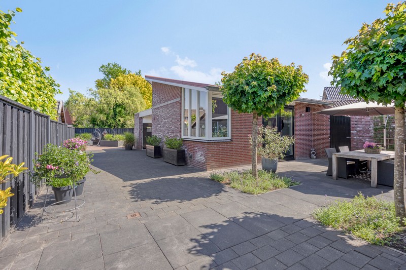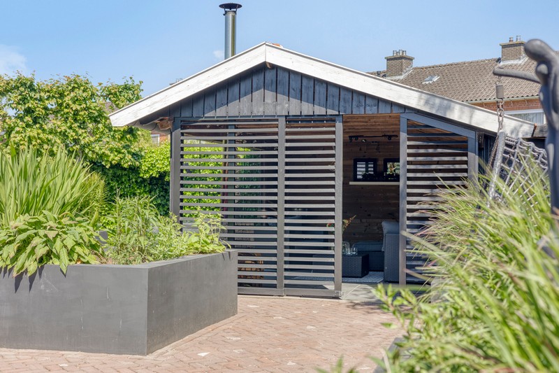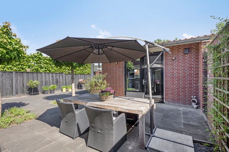 De achtertuin is strak aangelegd en biedt voldoende ruimte voor ontspanning, een speelplek voor de kinderen of tuinieren. Achter de woning ligt een grote luxe terrasoverkapping met kachel. Een heerlijk plekje voor een zomerse avond.