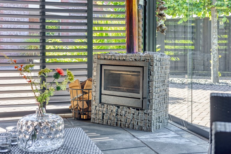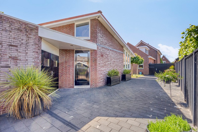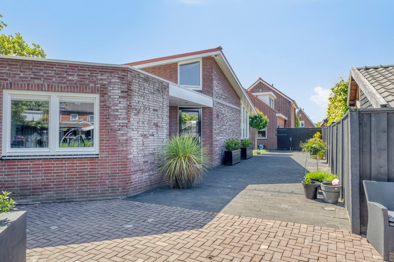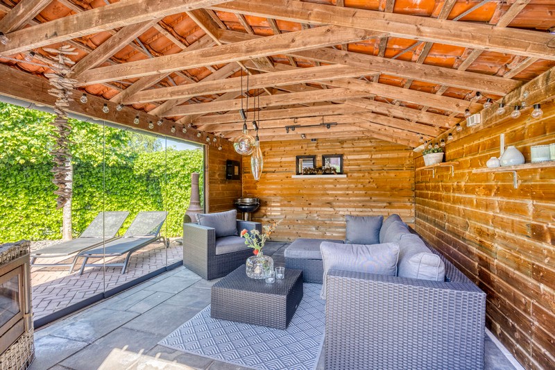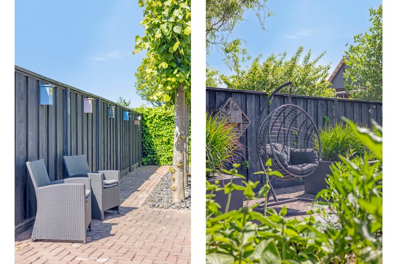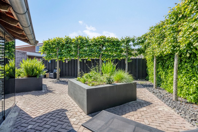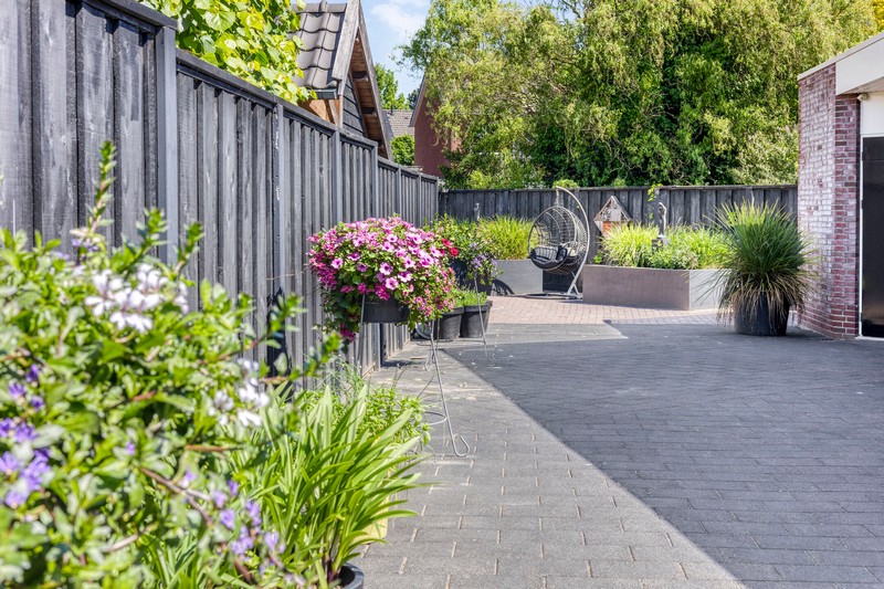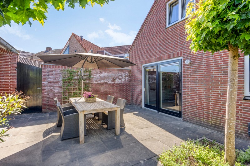 De achtertuin is strak aangelegd en biedt voldoende ruimte voor ontspanning, een speelplek voor de kinderen of tuinieren. Achter de woning ligt een grote luxe terrasoverkapping met kachel. Een heerlijk plekje voor een zomerse avond.