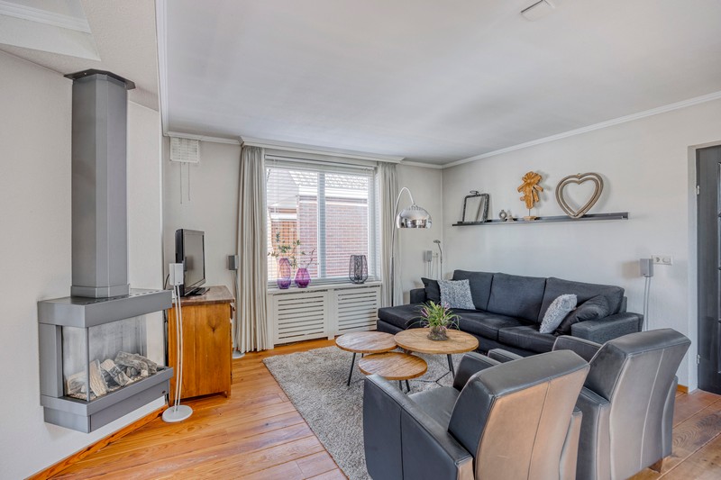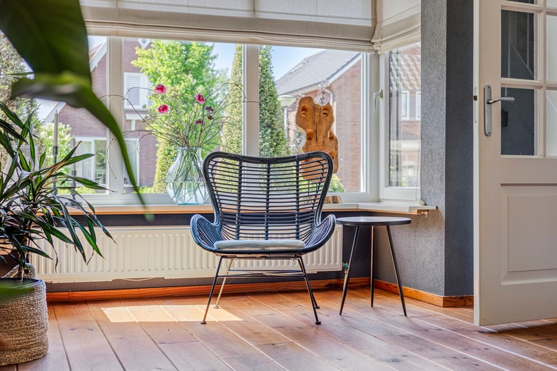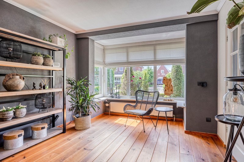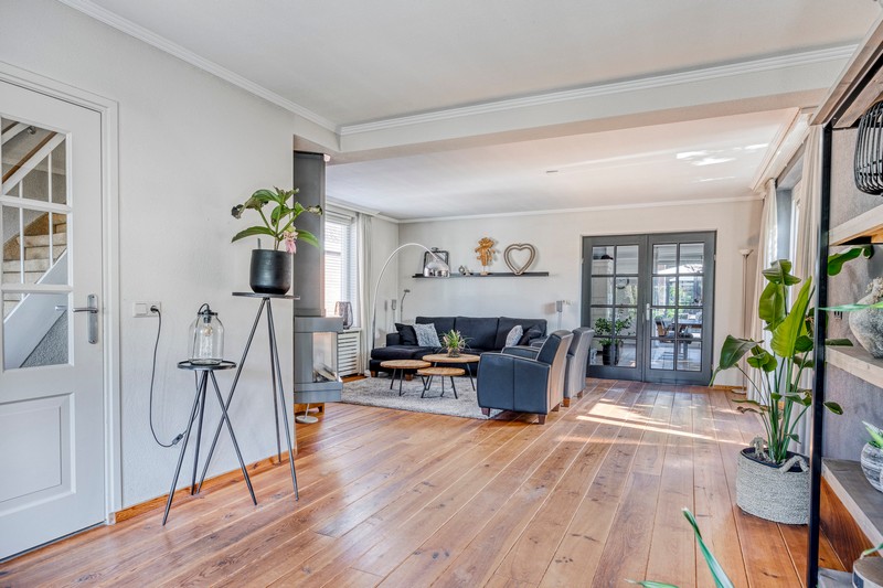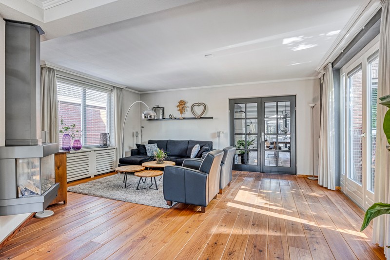 De woonkamer aan de voorzijde met erker, ademt een gezellige sfeer. Grote ramen aan drie zijden laten het zonlicht letterlijk binnenstromen. Via de stijlvolle suitedeuren is de woonkamer van de woonkeuken af te sluiten.