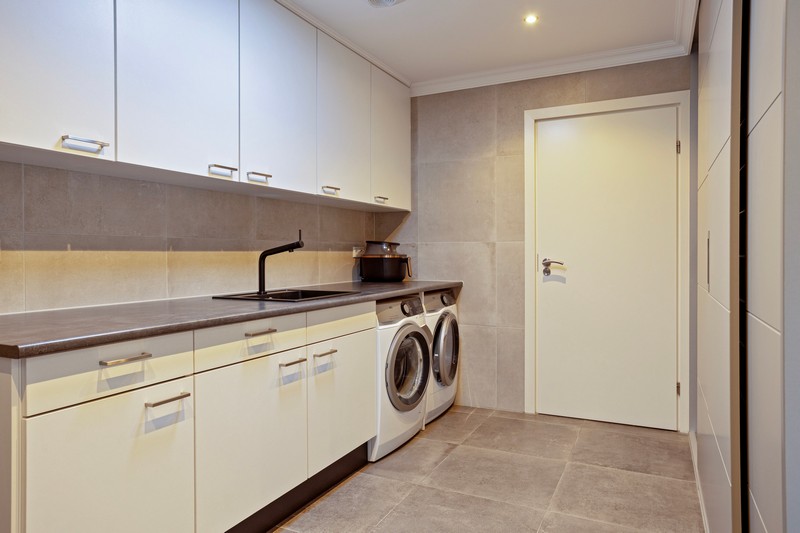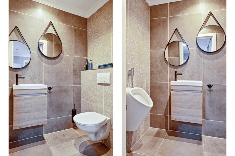 De tegels lopen door in de bijkeuken waar we aan de ene zijde een keukenblok aantreffen met daaronder de aansluitingen voor wasmachine en droger, en aan de andere zijde een grote kastenwand. De ruime toilet met dezelfde kleurstelling als bijkeuken en berging herbergt een toilet en urinoir.