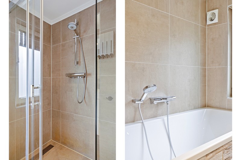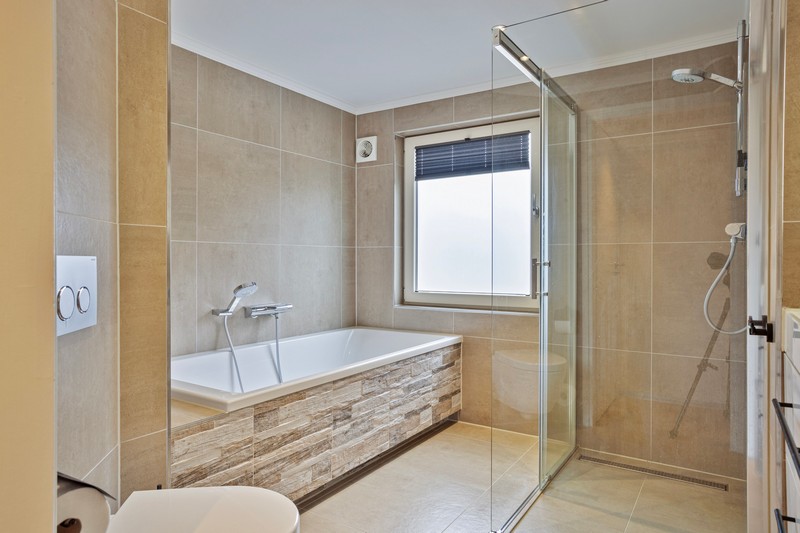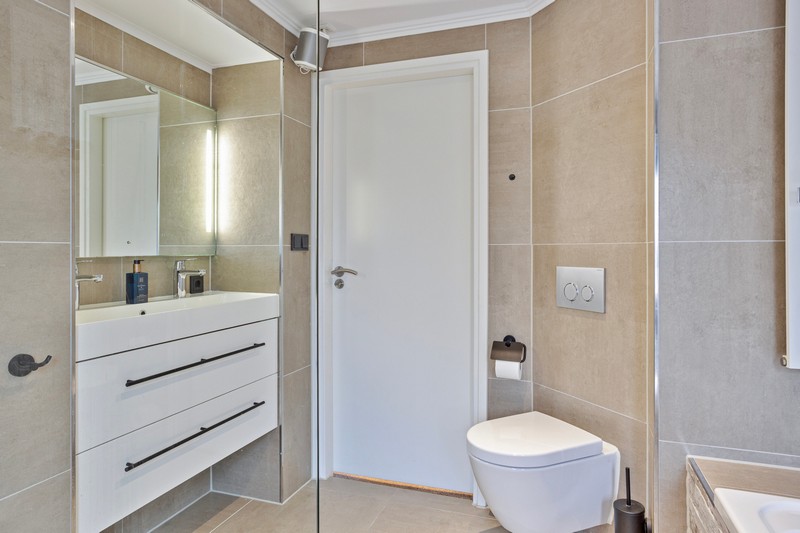 De moderne badkamer is voorzien van een wastafelmeubel, bad, inloopdouche en toilet. Een heerlijke plek om de dag fris te beginnen of ontspannen af te sluiten.