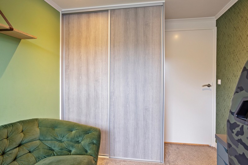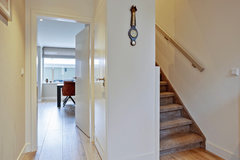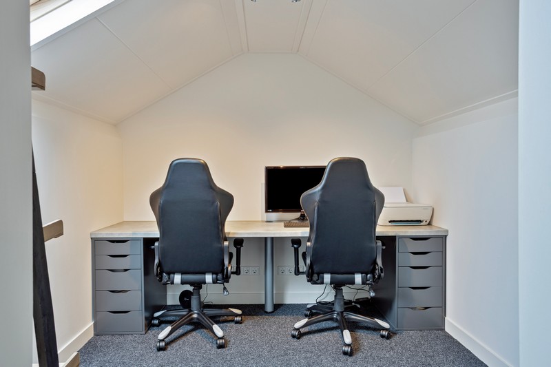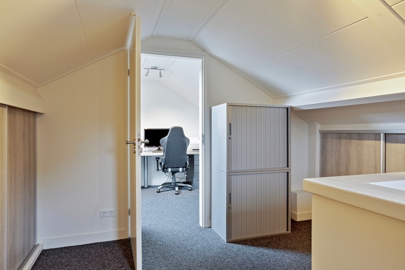 Met de vaste trap ben je aangekomen op de overloop van de tweede verdieping. Hier word je nog eens verrast met nóg eens met extreem veel ruimte. De technische installatie en veel bergruimte achter de knieschotten. Vanuit hier is de lichte, extra slaapkamer of werkruimte bereikbaar.
