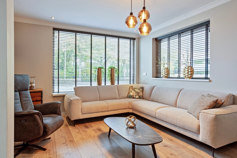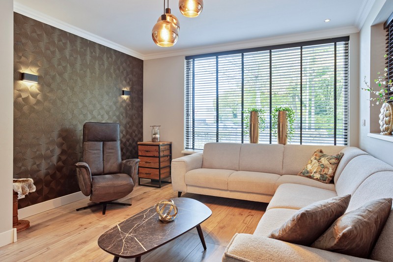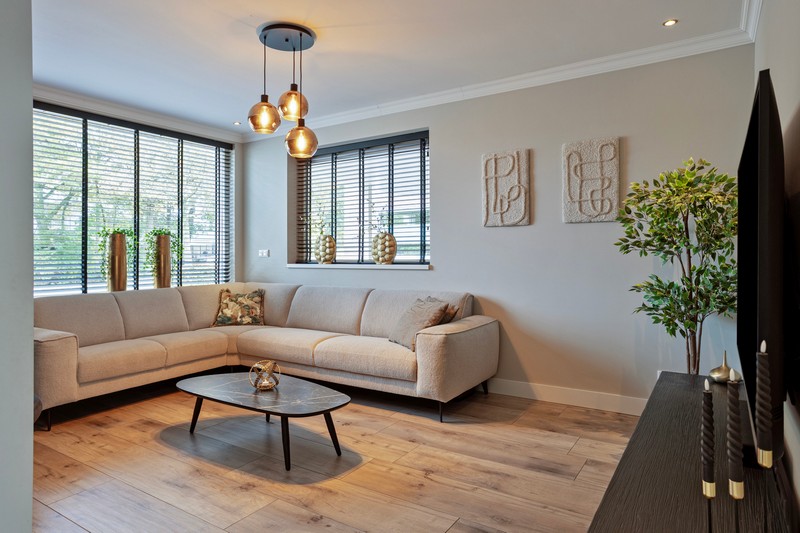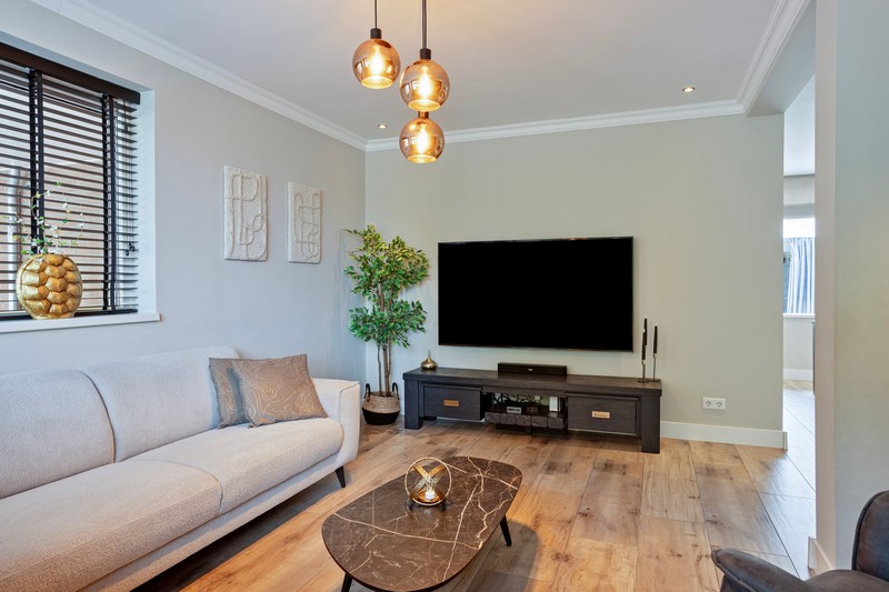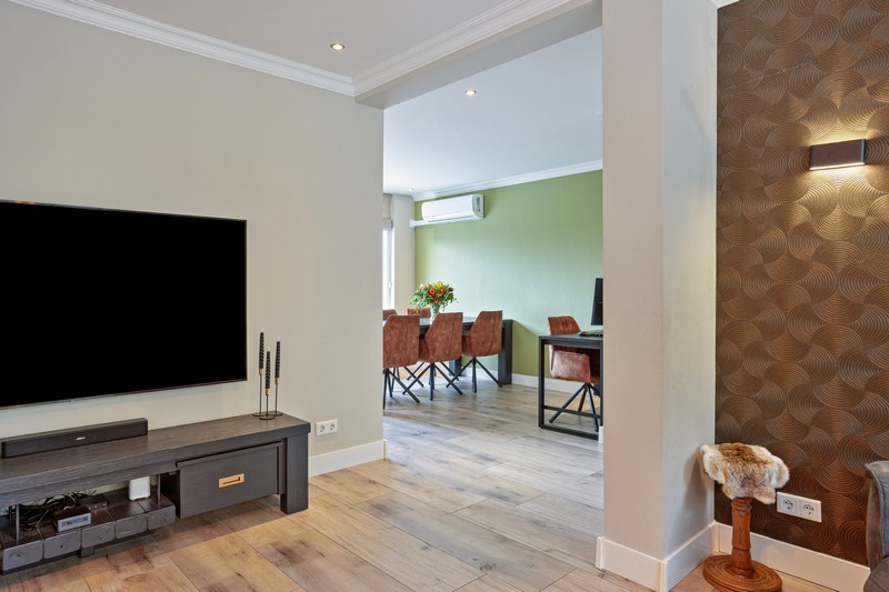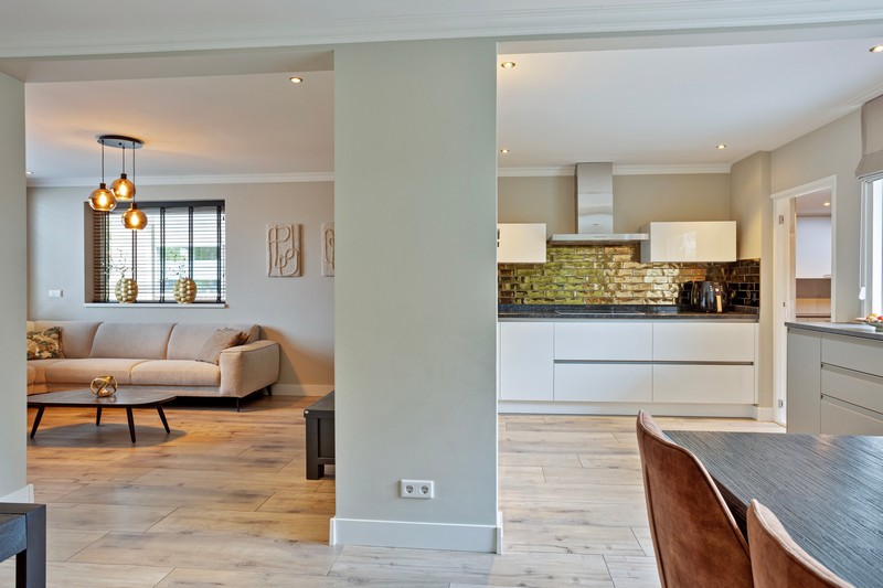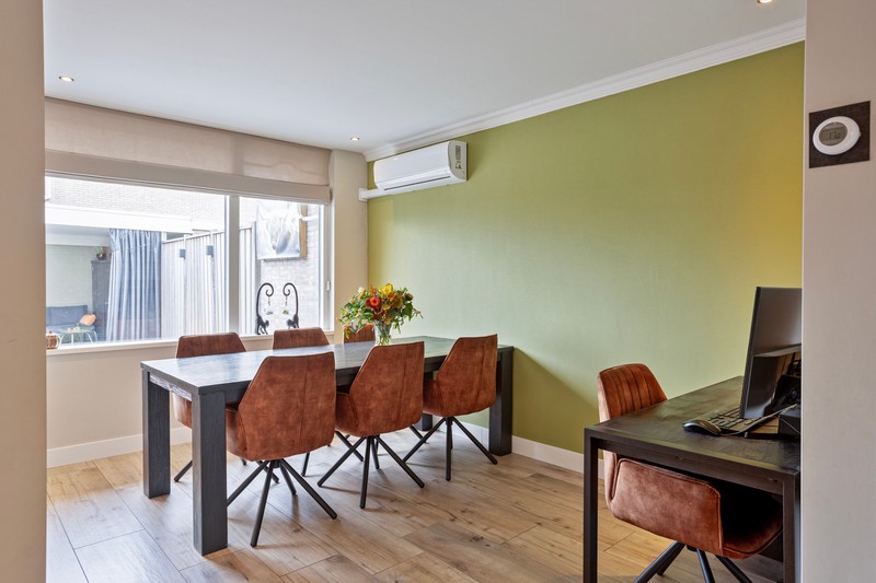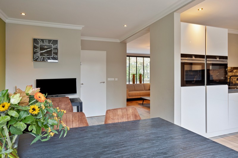 De Z-vormige woonkamer heeft een eetkamer aan de achterzijde direct naast de keuken en een woonkamer aan de voorzijde van haar. Licht stroomt aan 3 zijden binnen en de vloerverwarming zorgt voor een aangenaam klimaat evenals de airco.
