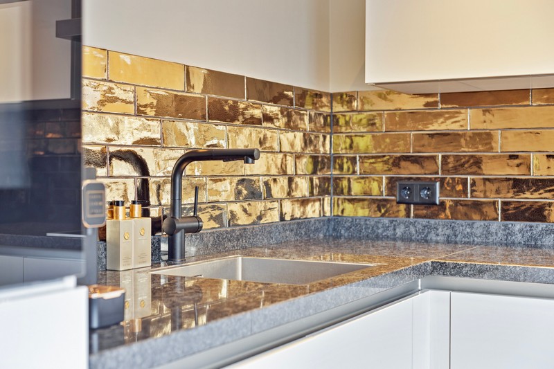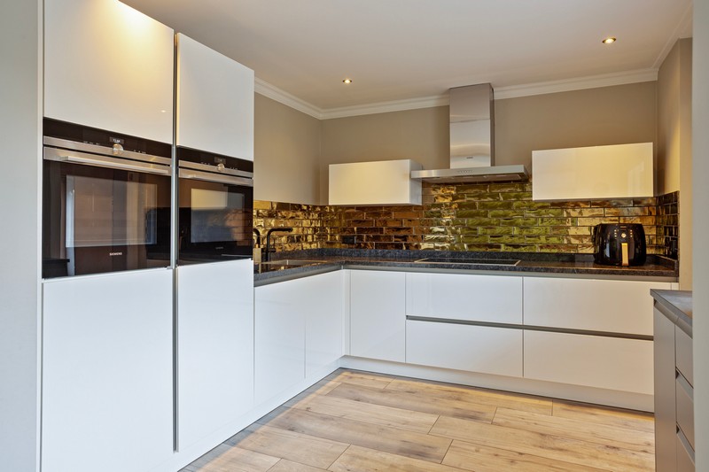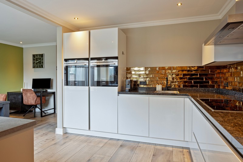Vanuit de bijkeuken komen we in de keuken met luxe en moderne inbouwkeuken. Deze is voorzien van een inductiekookplaat, afzuiging, oven, combimagnetron, koelkast en vaatwasser.