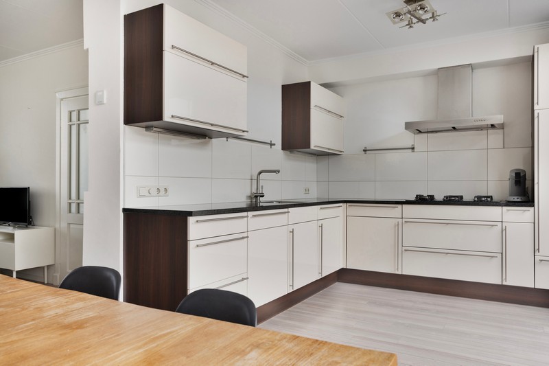 Aan de achterkant van het huis heeft de keuken een plek gekregen. De keuken is opgesteld in een hoek en heeft een vrijstaand wandmeubel. Hierdoor is er veel snij- en opbergruimte! Ook is er inbouwapparatuur aanwezig, waaronder een 5-pits gaskookplaat met afzuigkap, heteluchtoven en koel-/vriescombinatie. Tussen de keuken en de zithoek in is de eethoek opgesteld die ruimte biedt voor een grote eettafel en uitzicht op de heerlijke tuin met overkapping.
