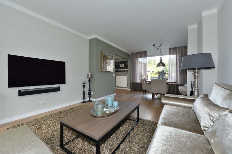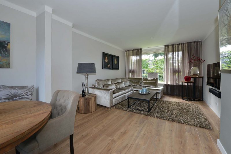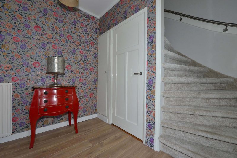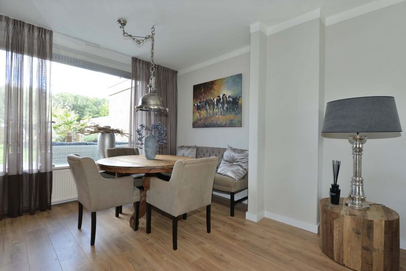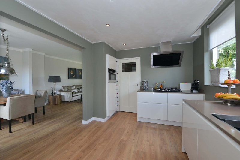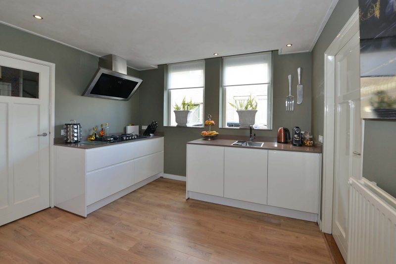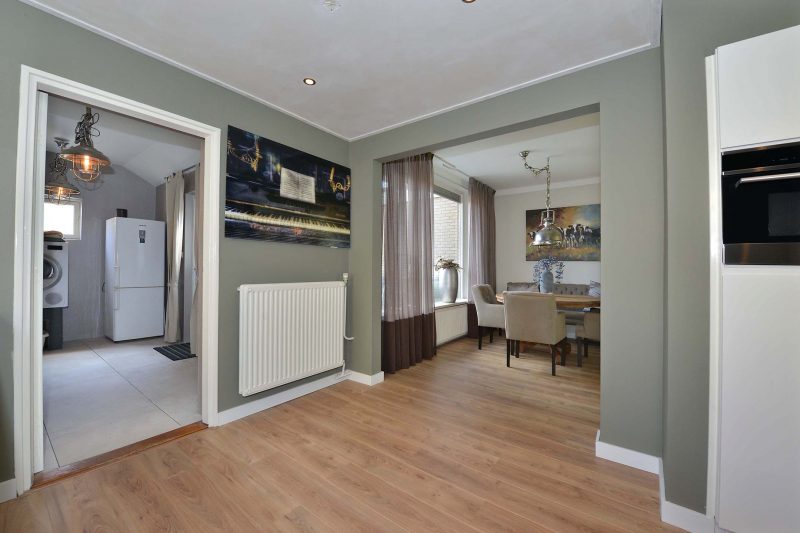 De huidige eigenaren hebben zich behoorlijk uitgeleefd op de woning. De gehele begane grond is volledig en bovenal smaakvol gemoderniseerd. En dat begint al in de hal waar we naast een trapopgang naar de verdieping ook een provisiekelder en toiletruimte vinden. De moderne inbouwkeuken is van alle gemakken voorzien waaronder een 5-pits gaskookplaat met afzuiging, koelkast, combimagnetron en vaatwasser. De tussenmuur tussen woonkamer en keuken is voor een groot gedeelte verwijderd waardoor één grote ruimte is ontstaan. Achter de keuken vinden we een ruime eveneens tot in de puntjes afgewerkte bijkeuken/achterentree met aansluitingen voor wasmachine en droger.