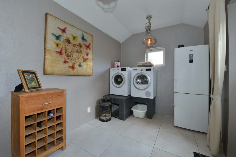 Wat erg prettig is, is de ruime oprit waarop meerdere auto’s geparkeerd kunnen worden. Uw auto’s staan op uw eigen perceel dus er is altijd plek. Mocht u de voorkeur hebben aan een droge plek voor uw heilige koe dan is dat ook mogelijk. U rijdt zo de ruime garage met op afstand te openen garagedeur binnen.