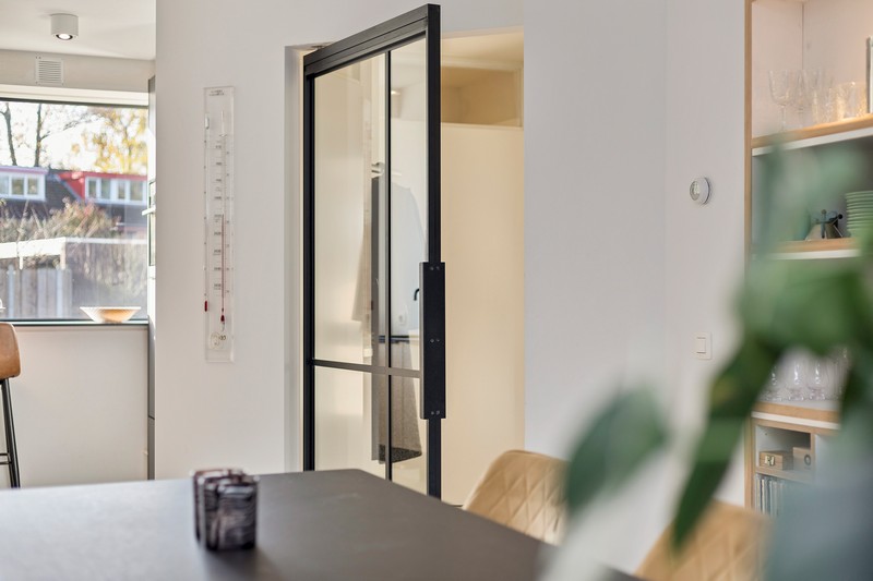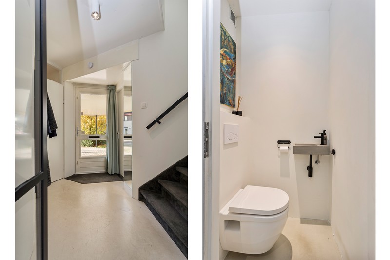 Laat je verrassen en treed binnen; de entree, waar ook de meterkast, toilet en trapopgang zit naar de eerste verdieping, is heerlijk licht en ruim. En geeft direct weer hoe smaakvol en doordacht dit huis in elkaar steekt. De moderne stalen deur biedt toegang tot de moderne lichte woonkamer.