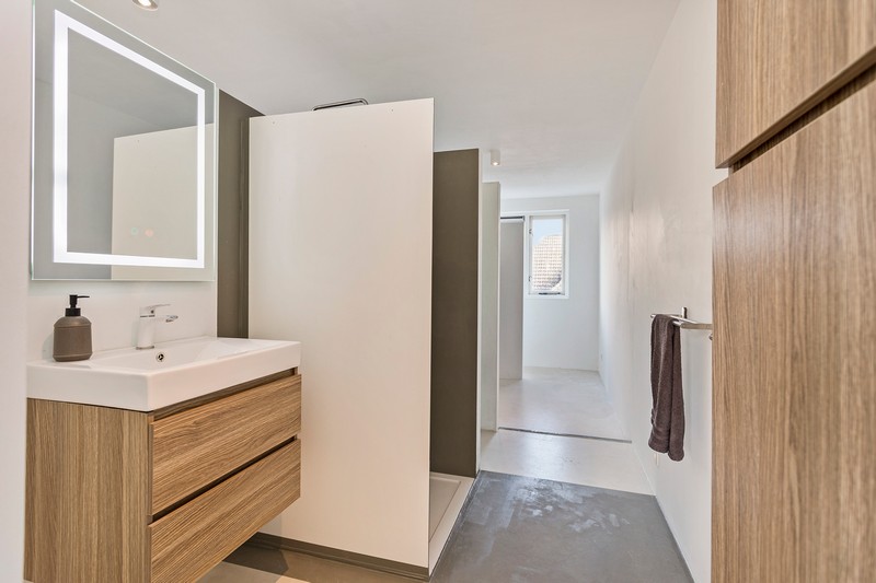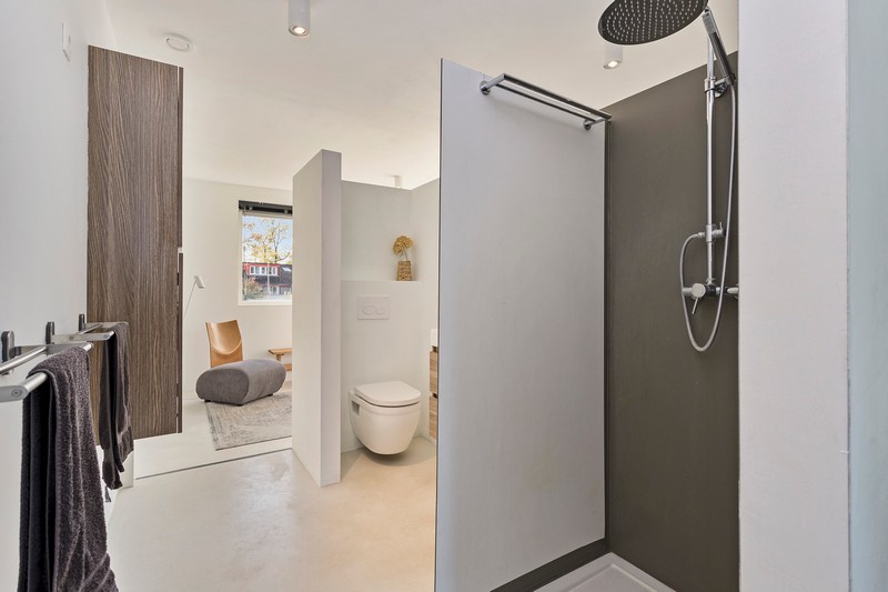Op de eerste verdieping aangekomen valt je op hoeveel moois dit huis je te bieden heeft. De verdieping is als een loft ingedeeld. Volg je de route naar links naar de achterzijde van de woning dan komen we achtereenvolgens langs de master bedroom, een ruime inloopkast, wasruimte, inloopdouche, toilet en wastafelmeubel en de open werkkamer met zolderberging die aan de voorzijde is gelegen.