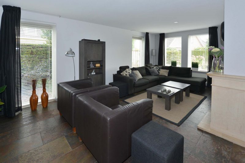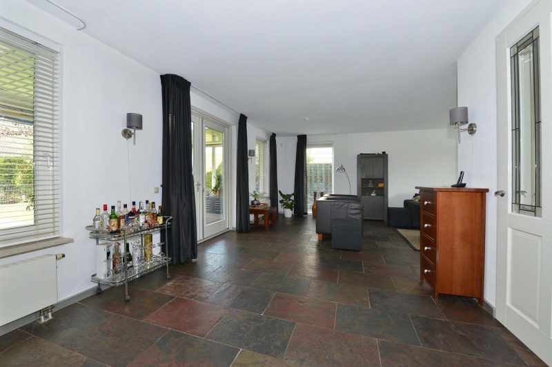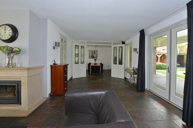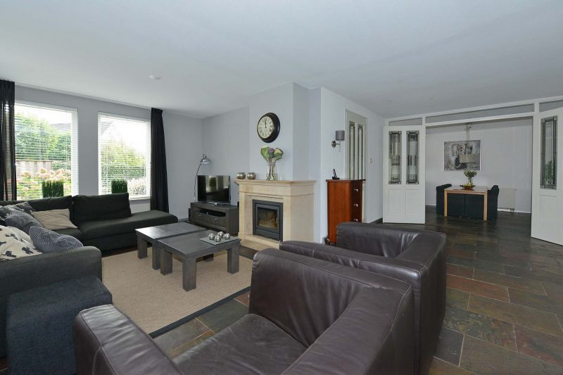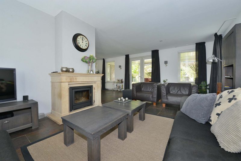 Via de overdekte entree komt u binnen in de zeer ruime hal met toilet en meterkast. De L-vormige woonkamer is bijzonder ruim en licht en is voorzien van een sfeervolle schouw met houtkachel en dubbele tuindeuren naar het achter de woning gelegen overdekte terras.