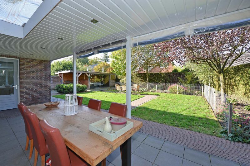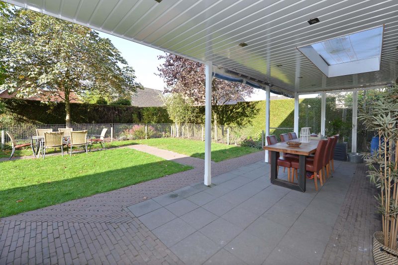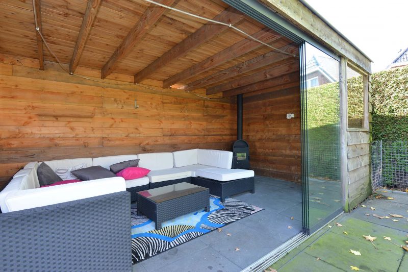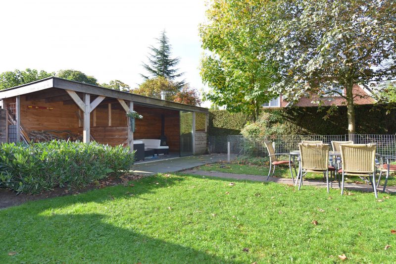 Direct achter de woning vinden we het overdekte terras. Met de tuindeuren open is het een verlengstuk van uw woonkamer. Tot in de late uurtjes kun je hier genieten van de ondergaande zon. En relaxen kun je ook onder de overkapping. Mocht het toch iets frisser worden buiten dan kun je met de houtkachel aan toch lekker blijven zitten. De hele dag door kunt u genieten van zon en schaduw!