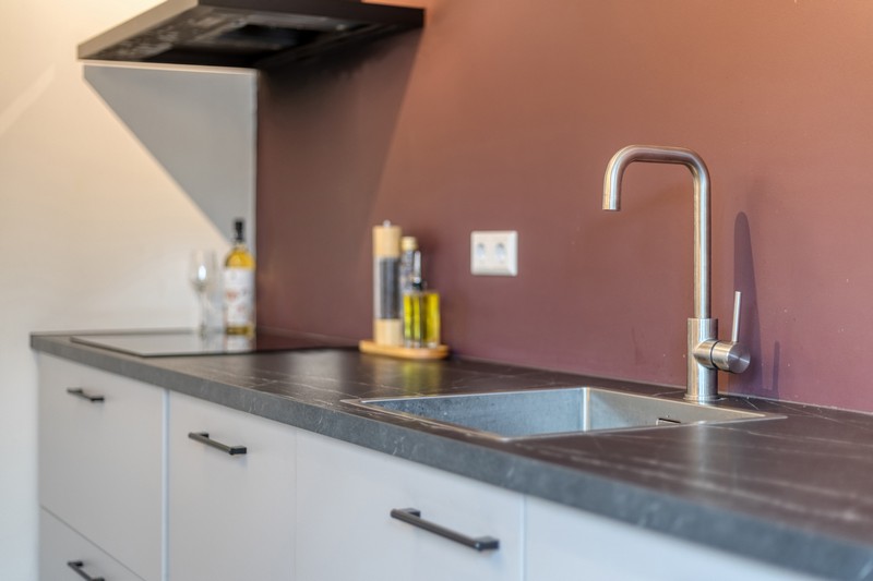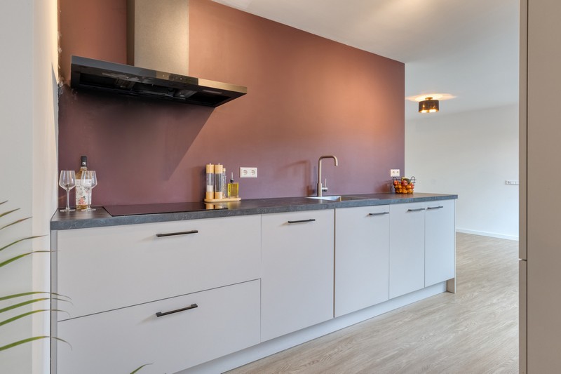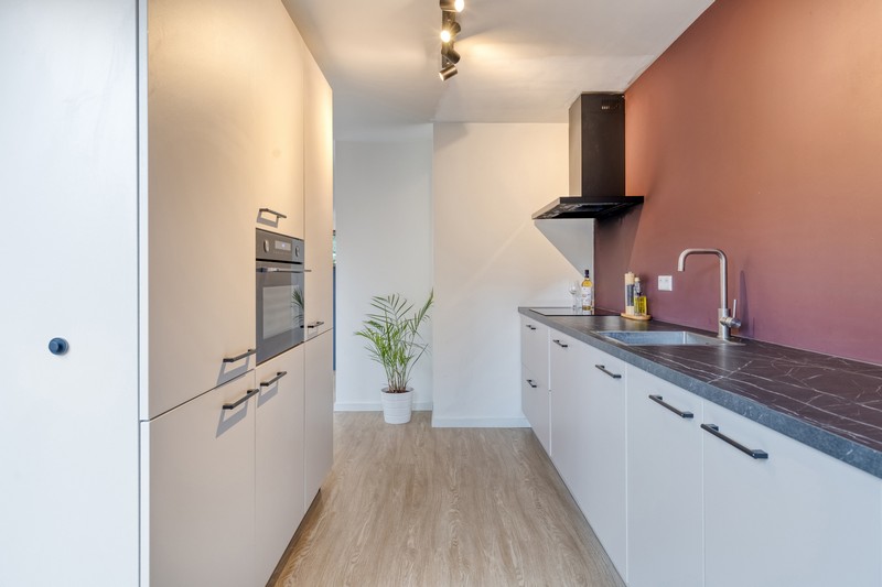 Via de hal met toilet en meterkast stap je de ruime L-vormige woonkamer binnen. Hier is meer dan genoeg plek voor een gezellige zithoek én een grote eettafel. Liever eten in de keuken? Ook dat kan: de woonkeuken is ruim opgezet en voorzien van een moderne parallelle keukenopstelling.