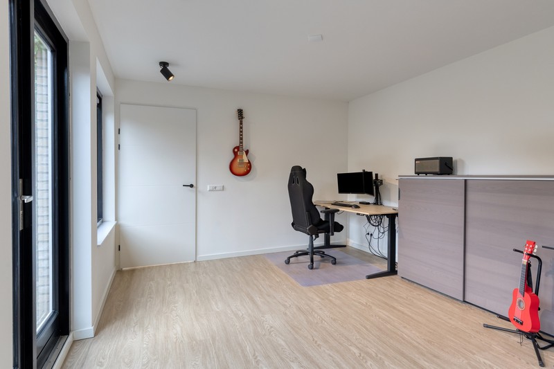 Aan de ene zijde vind je een inductiekookplaat, afzuiging, spoelbak en vaatwasser; aan de overzijde hoge kasten met een koel-/vriescombinatie en een combimagnetron. Aaneengesloten aan de halfopen keuken vinden we achtereenvolgens een eetkamer, ruime werkkamer en berging. Heb je een beroep aan huis? Zowel de eet- als werkkamer kan uitstekend als praktijkruimte aan huis functioneren. Indien gewenst is een eigen toegang vanaf de voorzijde van het huis zo gerealiseerd!