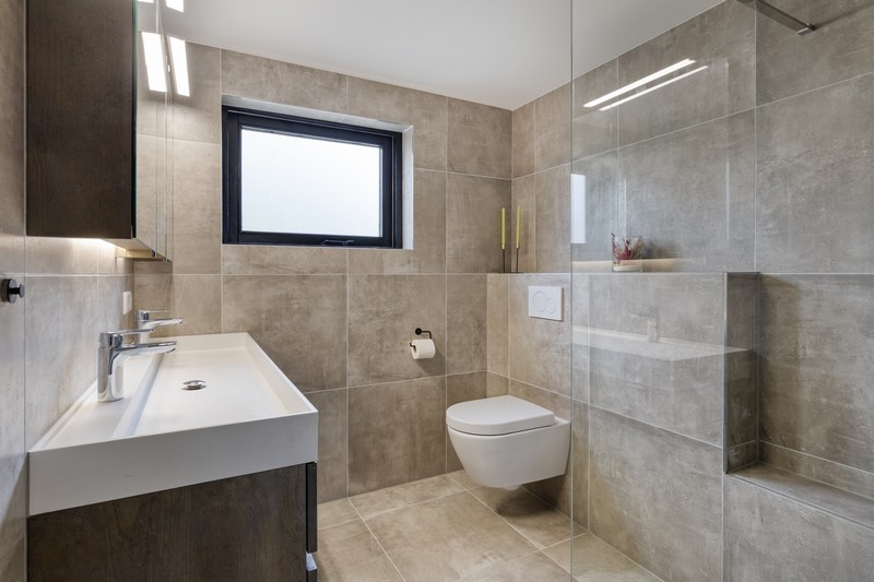 Op de eerste verdieping bevinden zich drie ruime slaapkamers en een stijlvolle badkamer met inloopdouche, tweede toilet, breed wastafelmeubel met twee kranen en een bijpassende spiegelkast met verlichting.