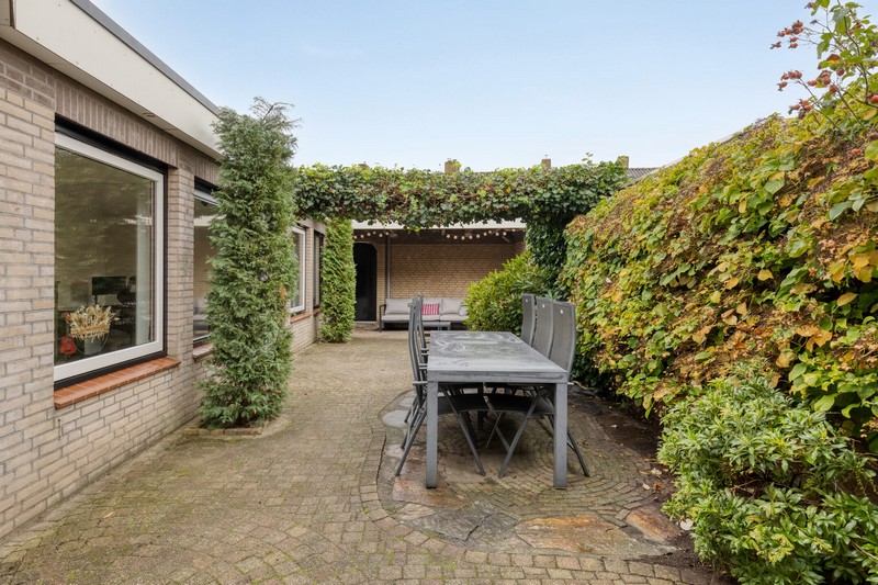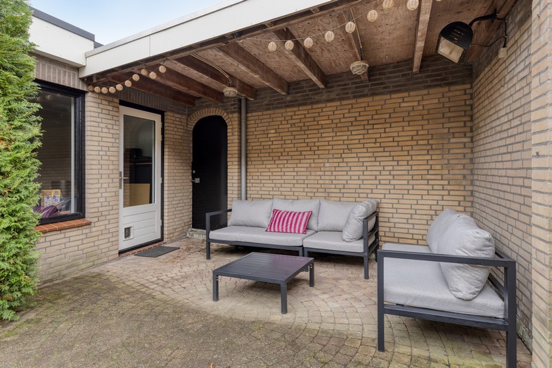 De achtertuin ligt op het zuiden, dus zon gegarandeerd. De tuin is onderhoudsarm aangelegd, bereikbaar via een achterom en heeft een fijne overkapping voor de nodige schaduw en lange zomeravonden.