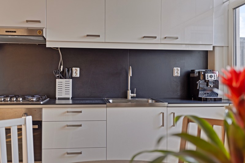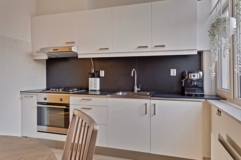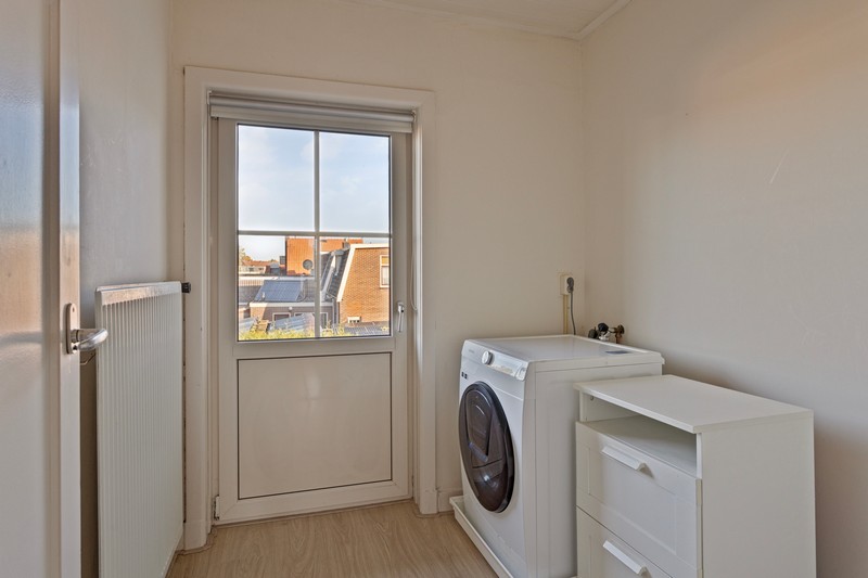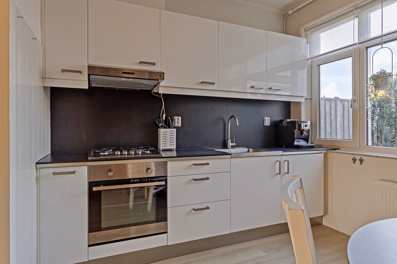 Via de hal met meterkast en trapopgang naar de 1e verdieping komen we in de woonkamer en de keuken. De woonkamer is straatgericht en heeft een erker en een houtkachel. De open keuken heeft een moderne inbouwkeuken voorzien van diverse inbouwapparatuur, te weten: 4-pits gaskookplaat, afzuigkap, oven en koelkast. Onder de trap vinden we de kelderkast met voldoende provisieruimte. De woonkamer en keukenvloer zijn voorzien van laminaat. Via de keuken kom je in het achterportaal. Deze ruimte beschikt over de wasmachine- en droger aansluiting. Via het achter portaal bereik je de achtertuin en is de moderne badkamer te bereiken die is uitgerust met een inloopdouche, hangtoilet en wastafelmeubel met waskom.